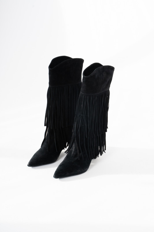 Botines Fringe Noir са ултраефектни черни велурени ботуши, които превръщат всяка визия в модно изявление. Моделът впечатлява с дългите велурени ресни, които създават движение и драматичен силует при всяка стъпка. С тънък ток, заострен връх и изискано изпълнение, тези ботуши съчетават бохо дух с модерна елегантност. Идеални за комбиниране с рокли, поли или кожени панталони, те придават стил и характер дори на най-семплите аутфити.