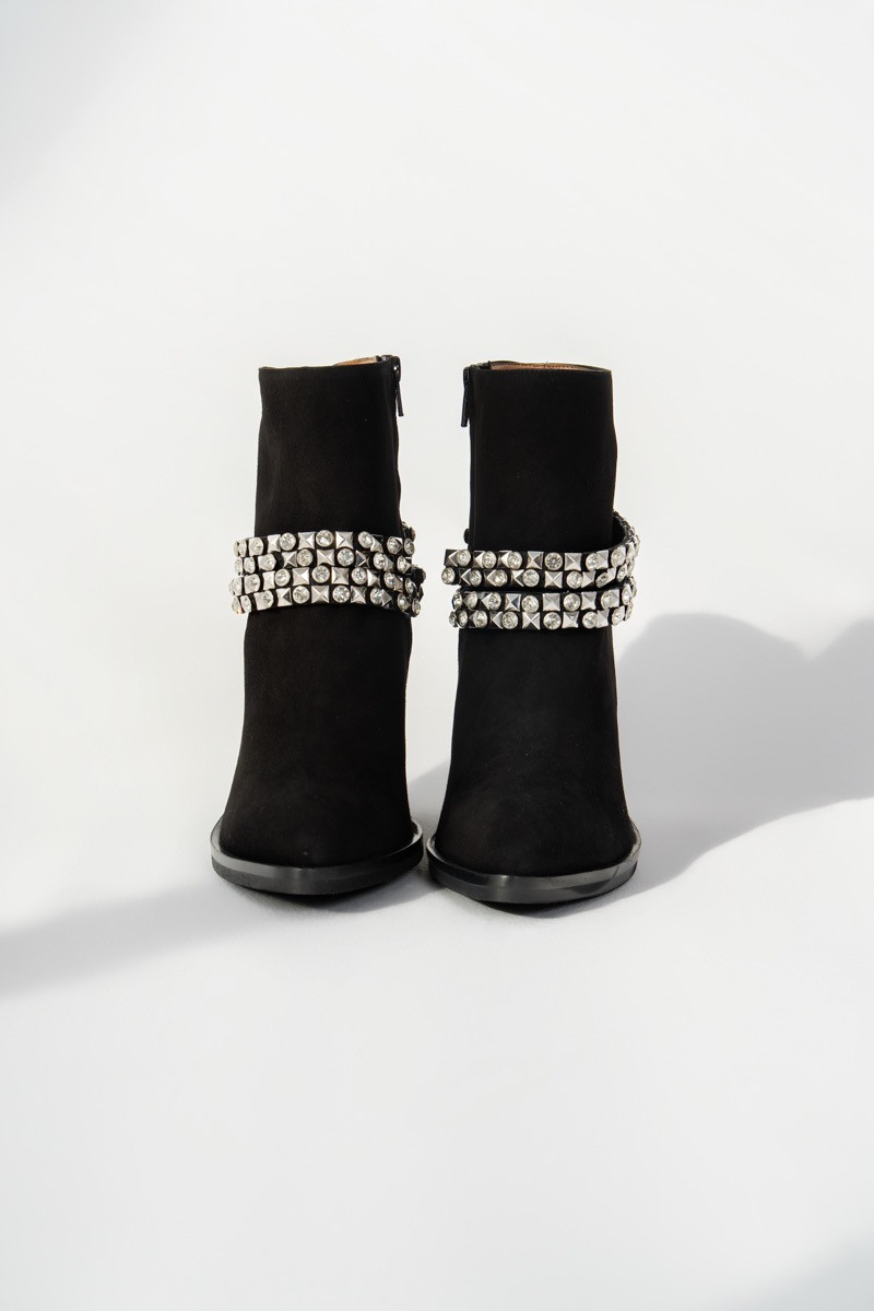 Боти с кристали – елегантен модел, изработен от фин черен велур, който впечатлява със своето модерно излъчване и изключителен блясък. Декоративните колани, изцяло обсипани с кристали, добавят луксозен акцент и превръщат всяка визия в ефектно модно изявление. Стабилният висок ток осигурява комфорт и увереност, а изчистеният силует ги прави подходящи както за вечерни събития, така и за стилни ежедневни комбинации. Идеален избор за жени с усет към детайла и желание да изпъкнат.