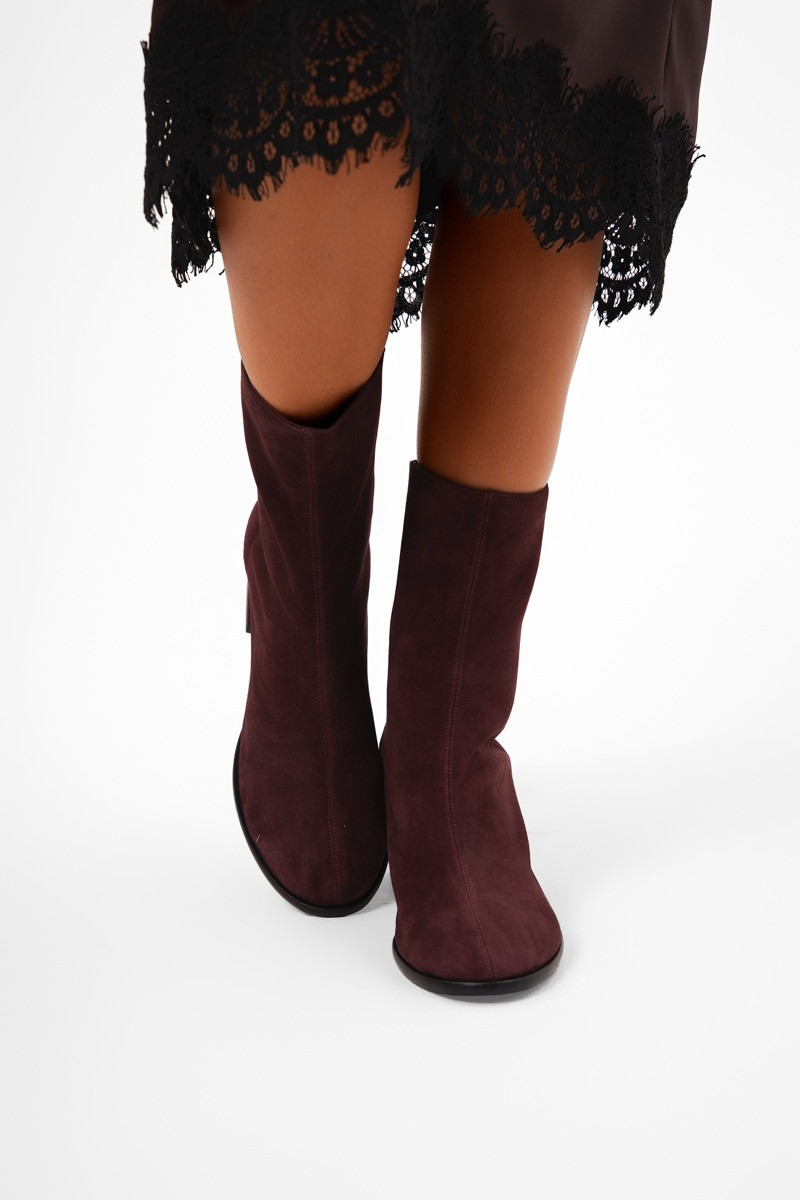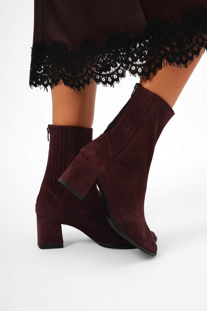 Елегантни велурени боти в дълбок бордо нюанс, които съчетават минимализъм и изтънченост. Изработени от мек естествен велур, те прегръщат глезена с изчистена, елегантна линия. Средно високият стабилен ток осигурява комфорт през целия ден, без компромис с женственото излъчване.Фината еластична вложка отстрани улеснява обуването, а меката вътрешна подплата гарантира удобство и топлина. Подметката е гъвкава и устойчива, подходяща както за градска, така и за по-елегантна визия.