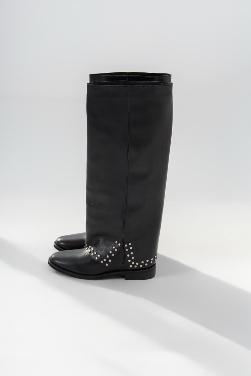 Boot Studded Noir е създаден за жената, която иска класика с характер. Моделът впечатлява с изчистена висока линия и деликатни метални капси, подредени в геометричен мотив около глезена, който добавя модерен рок акцент. Изработени от висококачествена естествена кожа, ботушите предлагат комфорт, устойчивост и стабилност през целия ден. Семплата форма се комбинира лесно както с рокли, така и с кожени панталони или плетива, превръщайки Boot Studded Noir в универсален завършек на безупречната градска визия.
