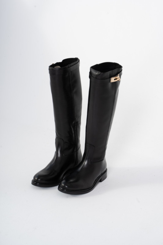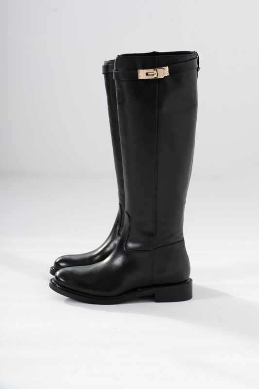 Bottero Black са класически черни ботуши от висококачествена естествена кожа, създадени за жени, които ценят елегантността и комфорта в ежедневието си. Моделът се отличава с изчистена линия, семпъл силует и фина каишка с деликатна метална закопчалка в златист тон, която придава лукс и характер.