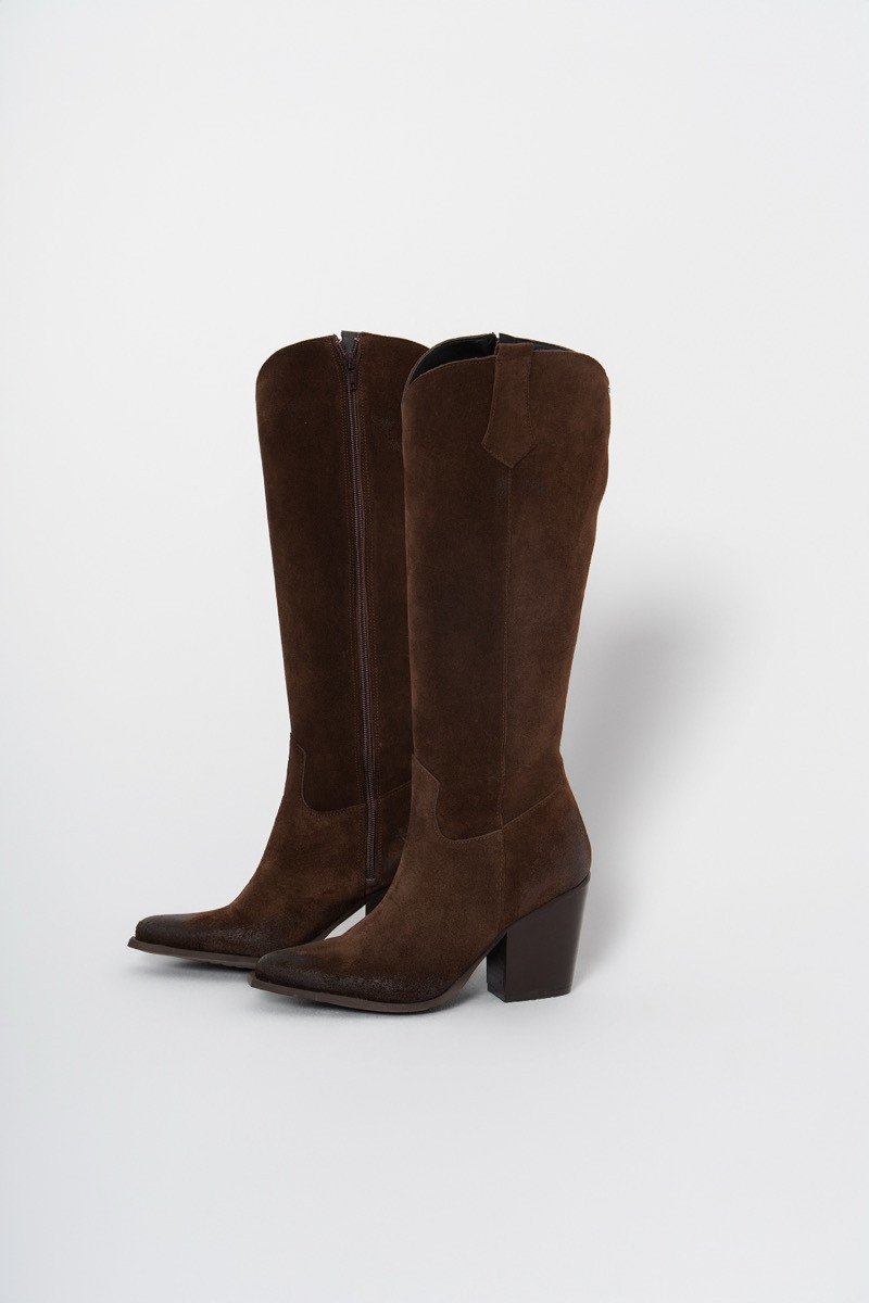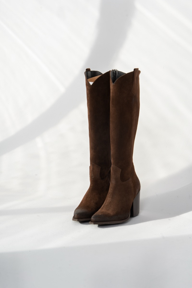 Dakota Cocoa са висококачествени ботуши от фин кафяв велур, вдъхновени от модерния уестърн силует. Моделът съчетава изчистен връх, елегантно заострена линия и стабилен висок ток, който придава комфорт и изтънченост при всяка стъпка. Меката велурена текстура подчертава топлия какаов нюанс, а прецизният дизайн оформя крака красиво и издължено. Стилни, универсални и изключително женствени – идеалният акцент към рокли, поли и деним през студените сезони.