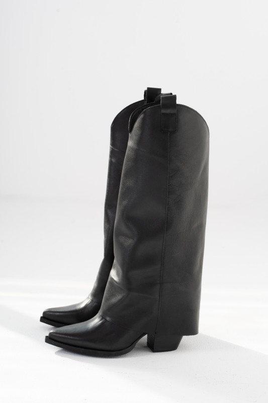 Вдъхновени от модерния уестърн силует, ботушите Dakota Noir комбинират минимализъм и характер в едно впечатляващо изделие. Меката естествена кожа прегръща крака, оформяйки елегантна, издължена линия, а свободната, леко „сгъната“ горна част създава модерен, артистичен обем.Стабилният ток придава увереност и комфорт, а скритите детайли в конструкцията осигуряват удобство при всяка стъпка. Dakota Noir са ботушите, които правят визията дръзка без усилие — идеални за рокли от плетива, силуетни поли или изчистени деним комбинации.
