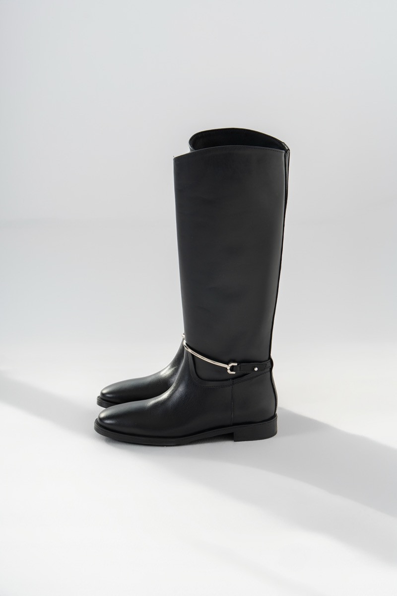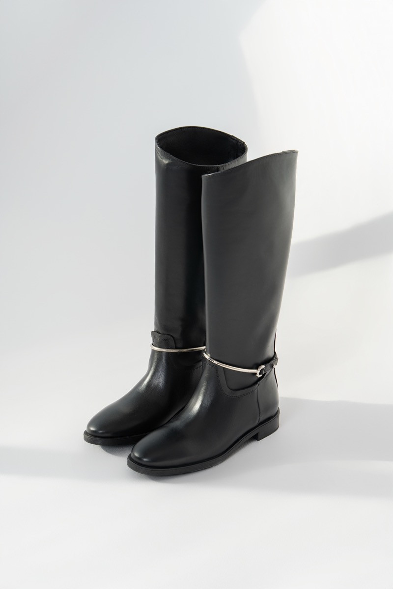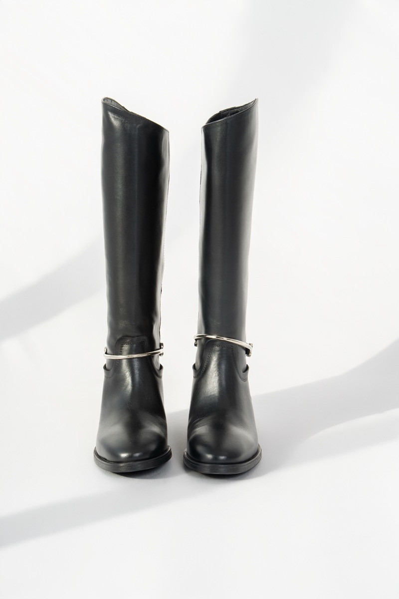 Тези елегантни чизми от естествена кожа впечатляват с изчистената си линия и луксозно излъчване. Меката, гладка кожа оформя силует, който прегръща крака с лекота, а асиметричният горен кант добавя модерен архитектурен детайл. Металният елемент около глезена е фин, но стилен акцент, който придава характер и подчертава минималистичния дизайн. Чизмите са универсални, удобни и идеални както за ежедневни визии, така и за по-елегантни комбинации през есенно-зимния сезон.