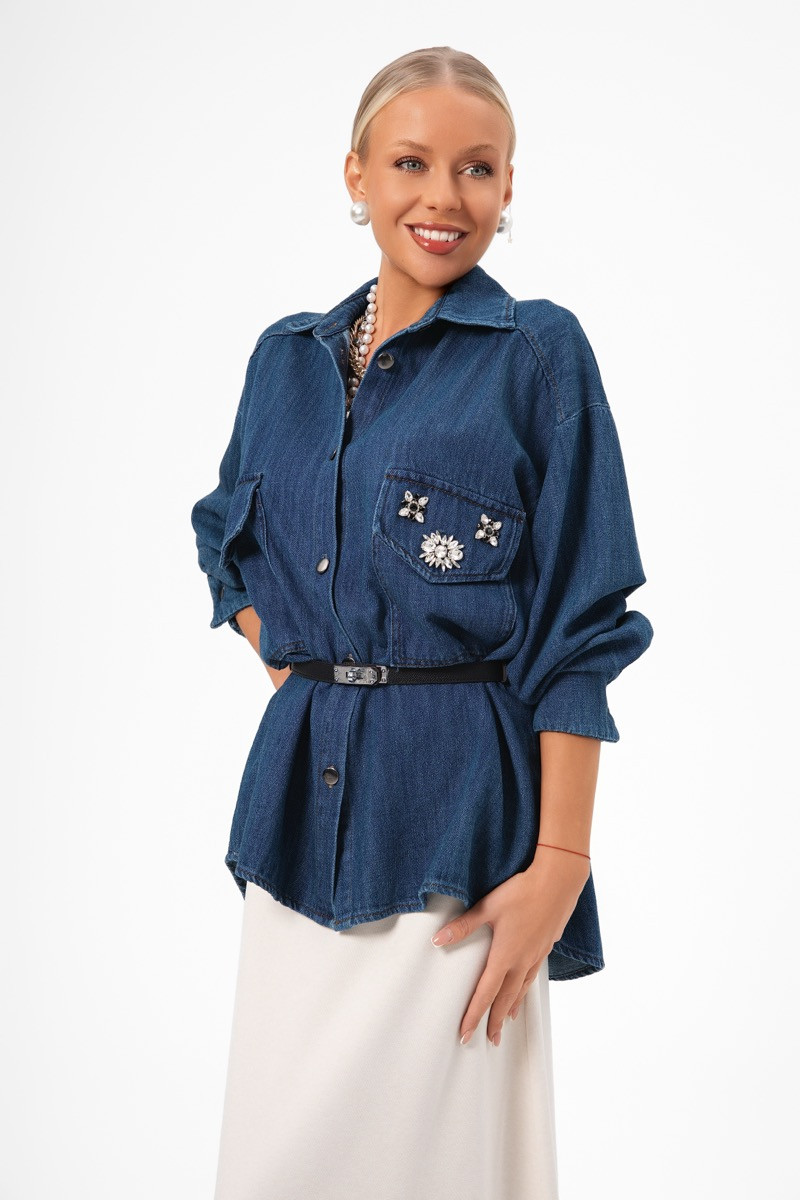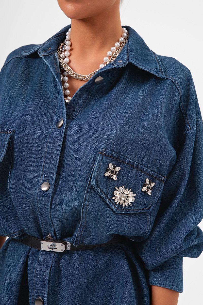 Деним риза с класическа линия и акценти от декоративни брошки, които добавят нотка блясък и женственост. Изработена от мек памучен деним със свободен силует, подходящ както за носене самостоятелно, така и като леко връхно. Коланът, използван на снимката, е само стилистичен акцент и не е включен към модела.