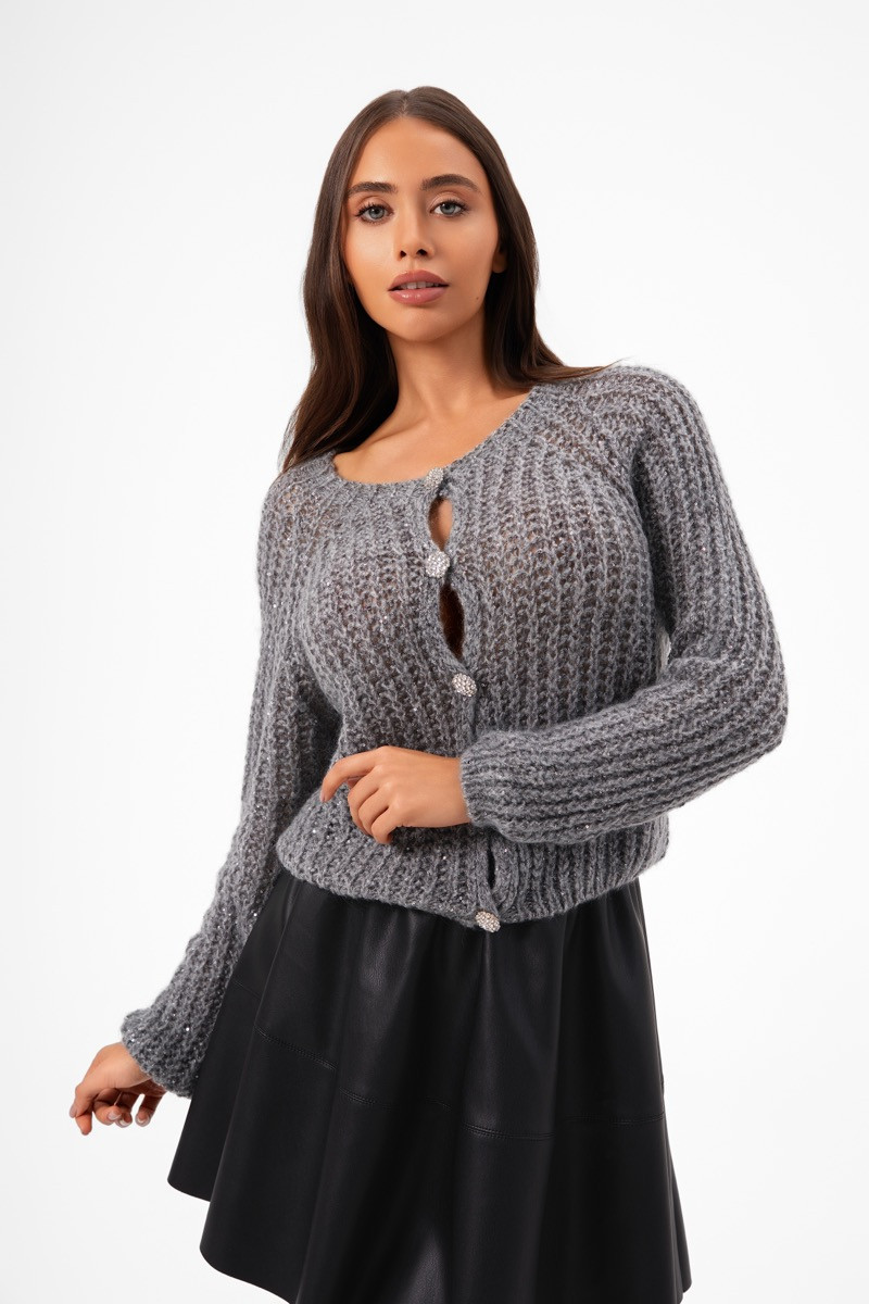 Закопчава се с декоративни копчета с кристални акценти, добавящи изтънчен блясък и луксозен завършек. Идеална както за ежедневието, така и за вечерни комбинации с пола или дънки.