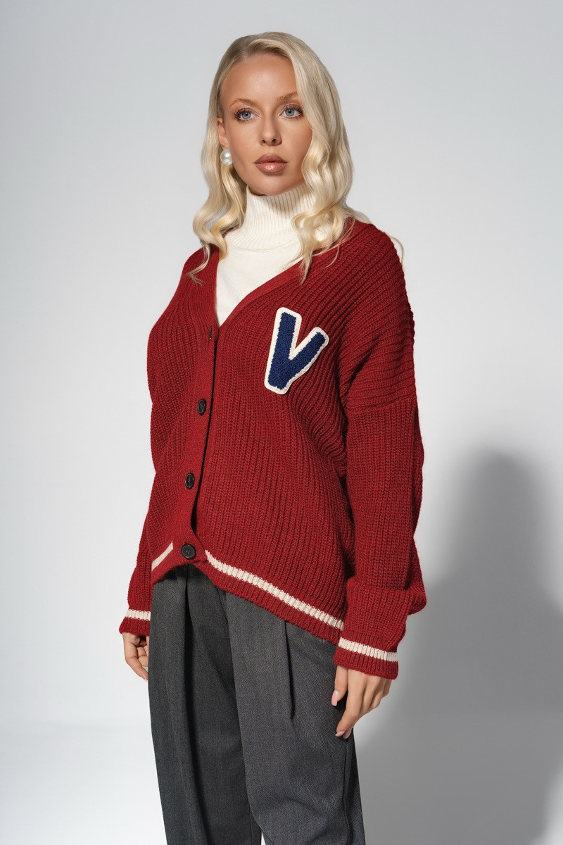 Мека и топла плетена жилетка в наситено винено червено, вдъхновена от колежанския стил. Моделът е със свободна кройка, едро плетиво и контрастни детайли в бяло по подгъва и ръкавите. На предната част е поставена апликация „V“, която придава модерен и характерен акцент. Идеална за ежедневни визии, layering и уютни есенно-зимни комбинации.