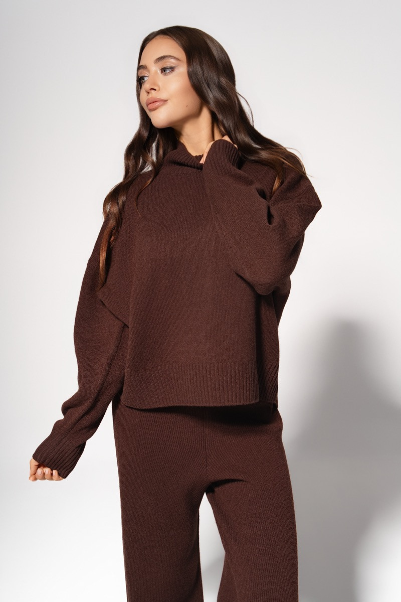 Комплект от финно плетиво в дълбок шоколадов нюанс, съчетаващ пуловер с мека висока яка и панталон с широка, елегантно падаща кройка. Материята е пухкава, нежна и изключително комфортна, а силуетът е модерен, минималистичен и женствен. Комплектът създава усещане за уют и лукс, подходящ както за ежедневни излизания, така и за по-стилни визии през студените дни. Универсален, топъл и effortlessly chic.