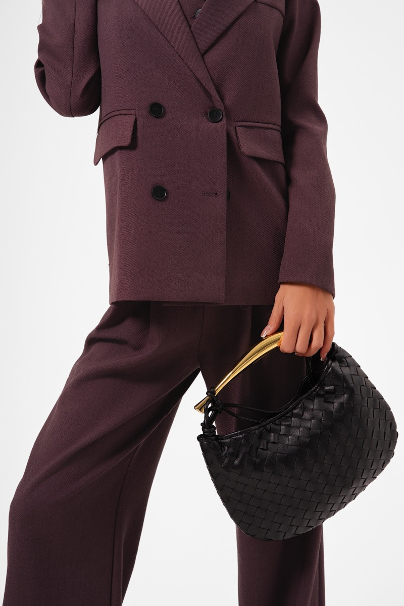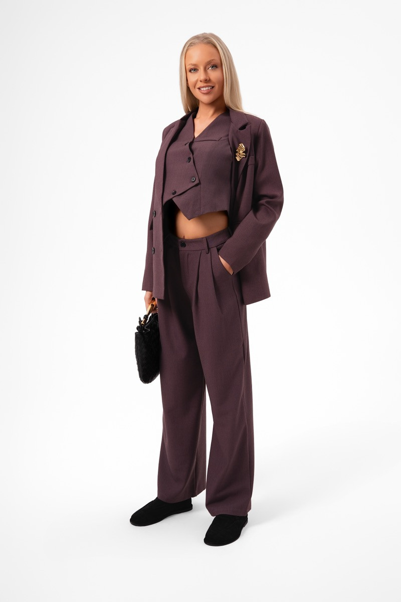 Костюм от три части, съчетаващ съвременна елегантност и изтънчена женственост. Състои се от структурирано сако, прав панталон и къс топ с асиметрична линия. Изработен от висококачествена материя с фина текстура, която придава лек обем и комфорт. Перфектен избор за модерна, уверена визия.Умален, размер М отговаря на С.