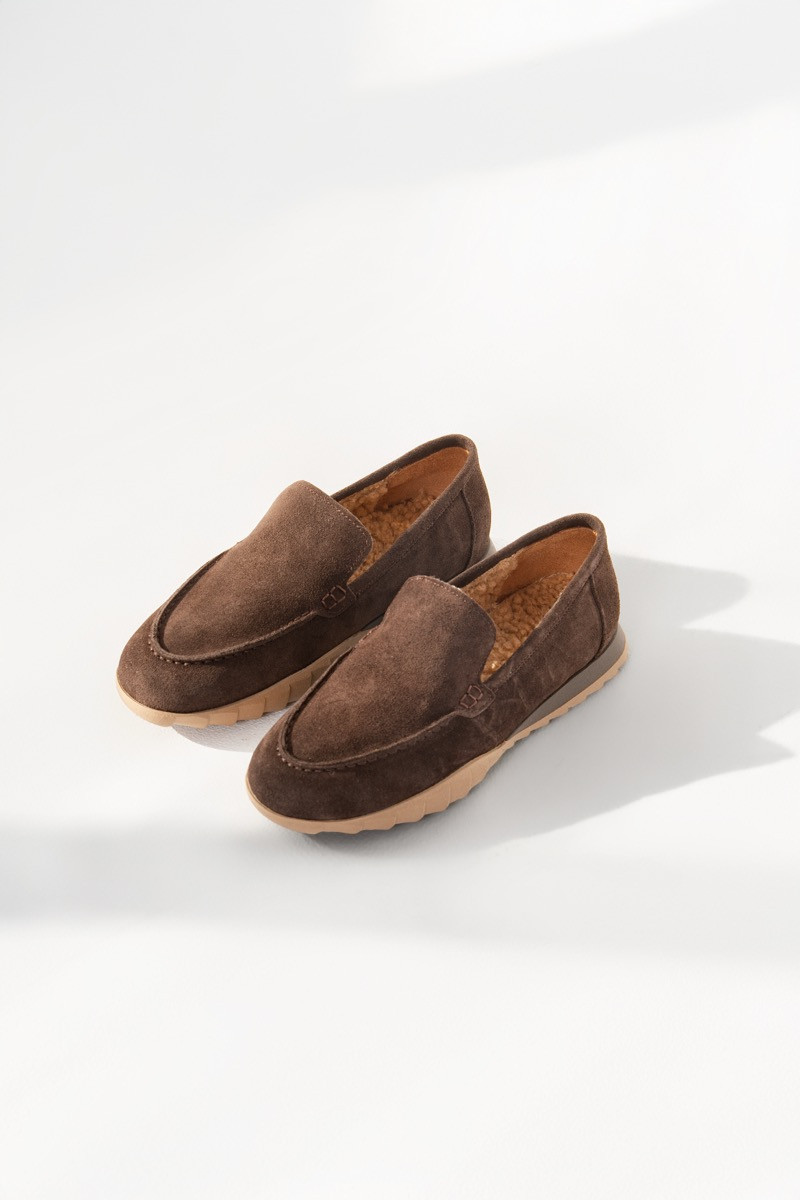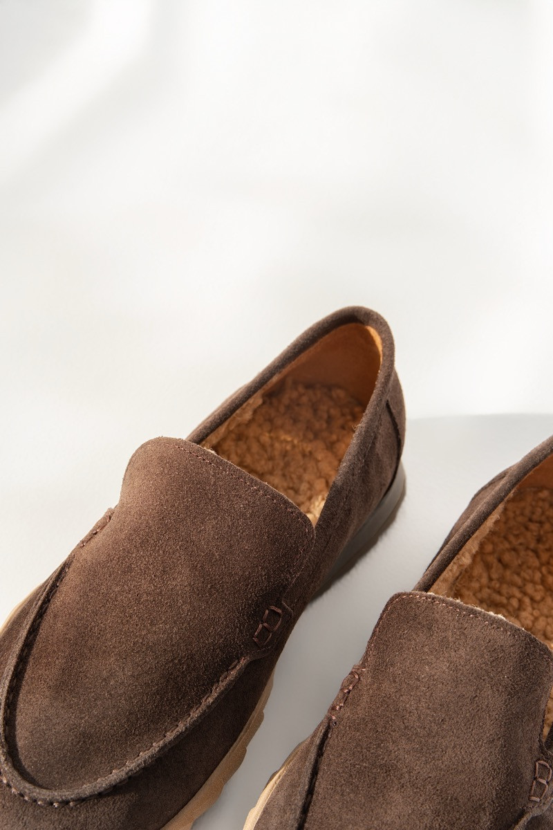Suede Cozy Loafers са перфектното съчетание между комфорт и ежедневна елегантност. Изработени от мек велур в богат кафяв нюанс, те прегръщат стъпалото с нежна топлина благодарение на вътрешната подплата от вълнена материя.Подметката е леко релефна и осигурява стабилност, гъвкавост и удобство при всяка стъпка — идеални за динамичното ежедневие.