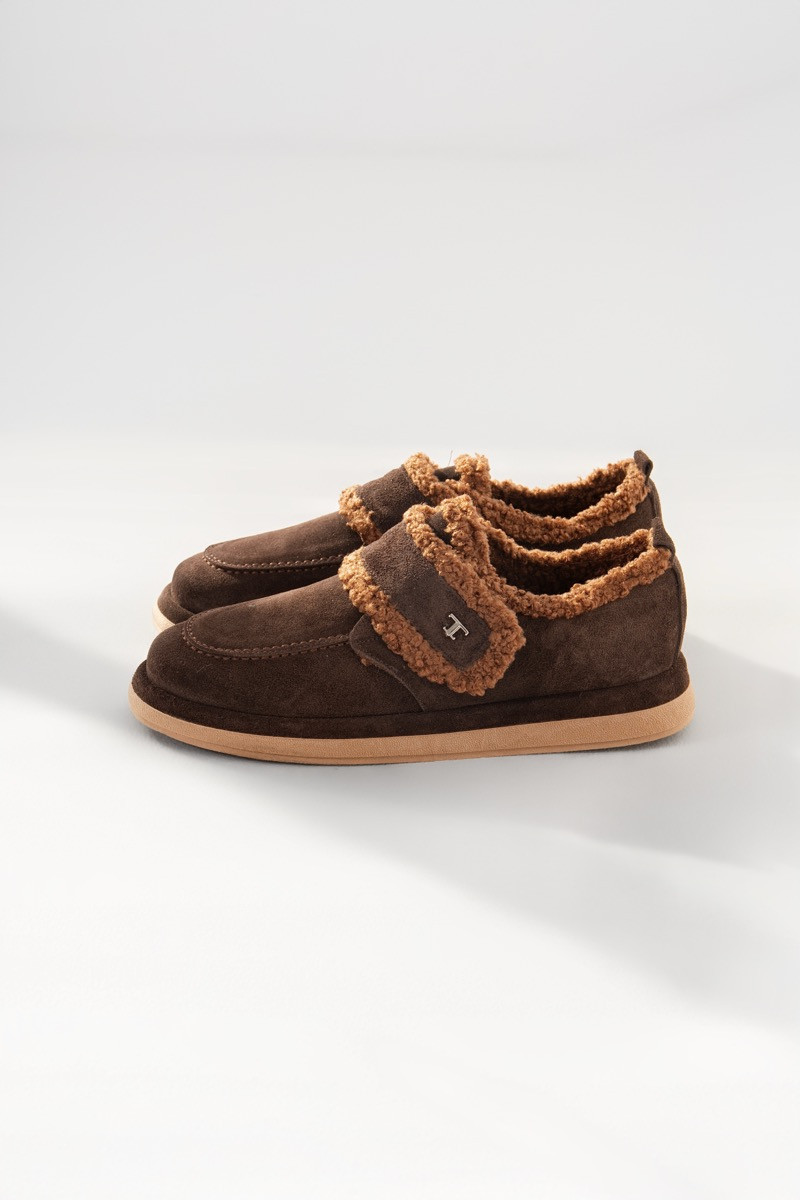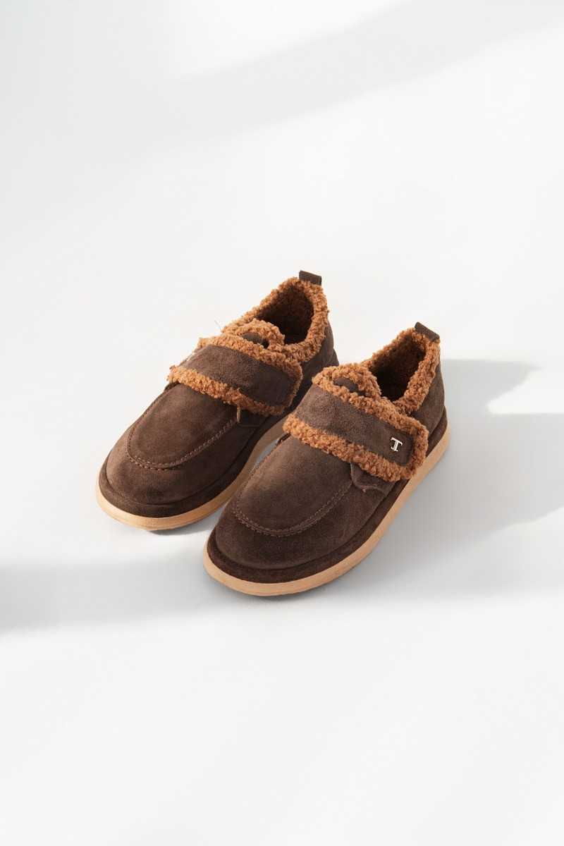 Потопете се в мекота и топлина с Teddy Buckle Loafers – перфектният зимен модел, съчетаващ уют, функционалност и модерна естетика.Изработени от висококачествен кафяв велур, обувките впечатляват с плътна „teddy“ подплата в карамелен тон, която осигурява комфорт и нежна топлина през целия ден. Декоративната каишка с метален елемент добавя елегантен акцент и подчертава характерния силует на модела.