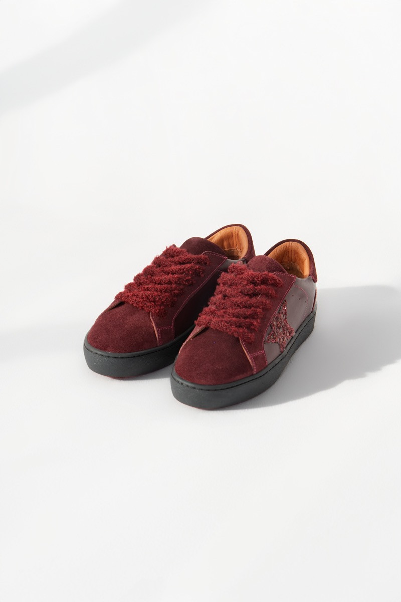 Сникърси в наситен бордо нюанс, изработени от мек велур и комбинирани с кожени странични панели за модерен, луксозен ефект. Отличителният акцент на модела са пухкавите текстурни връзки, които придават уникалност и характер на обувките.Стабилната черна подметка предлага комфорт и гъвкавост при движение, а вътрешната част е мека и удобна за целодневно носене. Цветовата комбинация и текстурните детайли превръщат тези сникърси в универсално допълнение към casual и street стил визии.