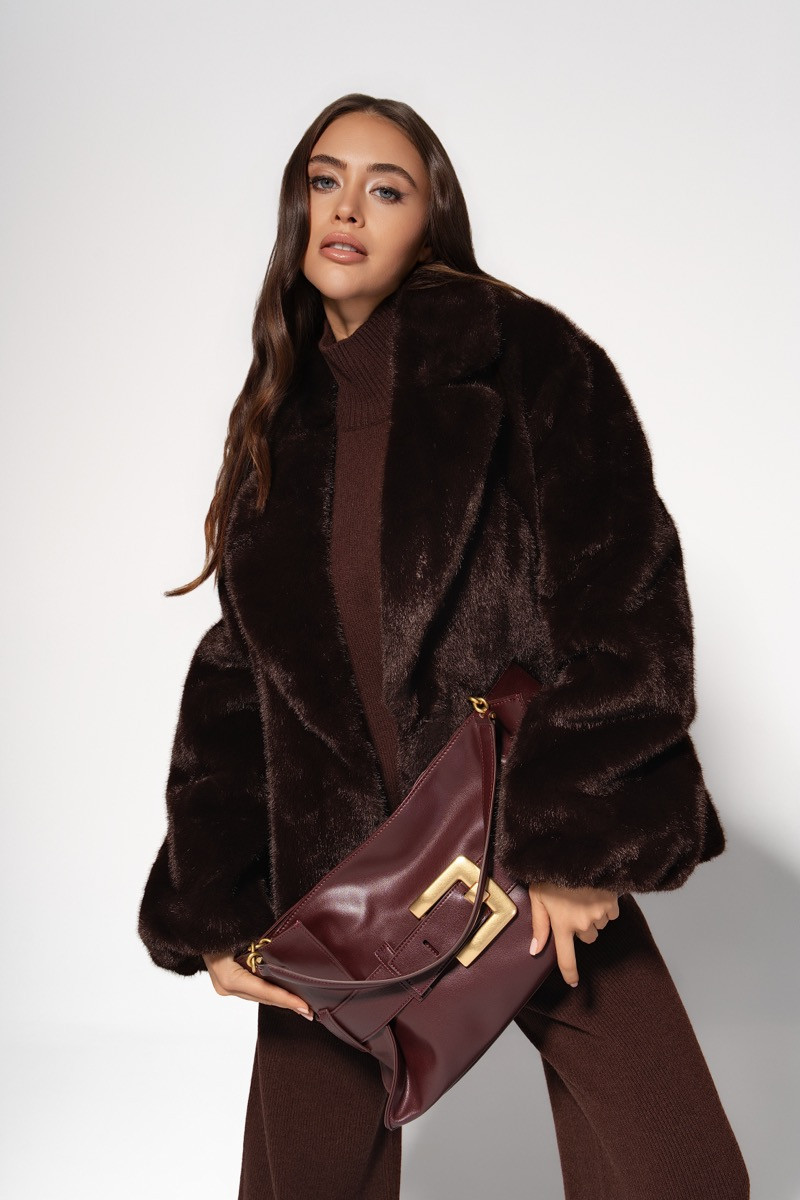 Палто в наситен тъмен шоколадов цвят, изработено от луксозна, плътна и изключително мека еко кожа. Моделът впечатлява с обемна силуетна линия, големи ревери и елегантно паднала форма, която придава модерен и богато изглеждащ завършек. Топло, комфортно и с усещане за разкош – палтото е перфектният акцент за стилни градски визии през студения сезон.