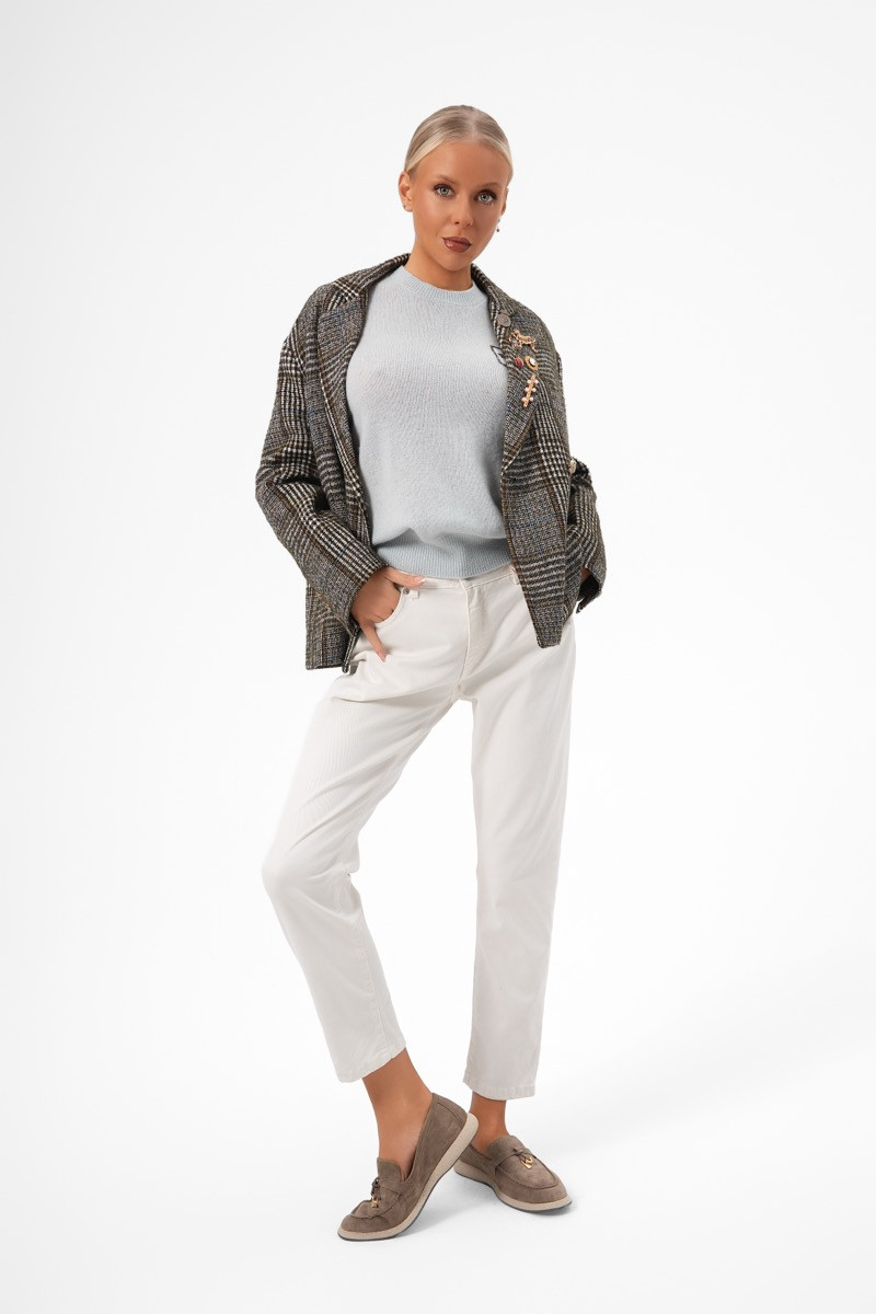 Прав панталон с висока талия, изработен от плътен памук в нежен кремав нюанс. Материята осигурява комфорт и структура, а изчистеният дизайн позволява безброй стилни комбинации — от ежедневни до елегантни.