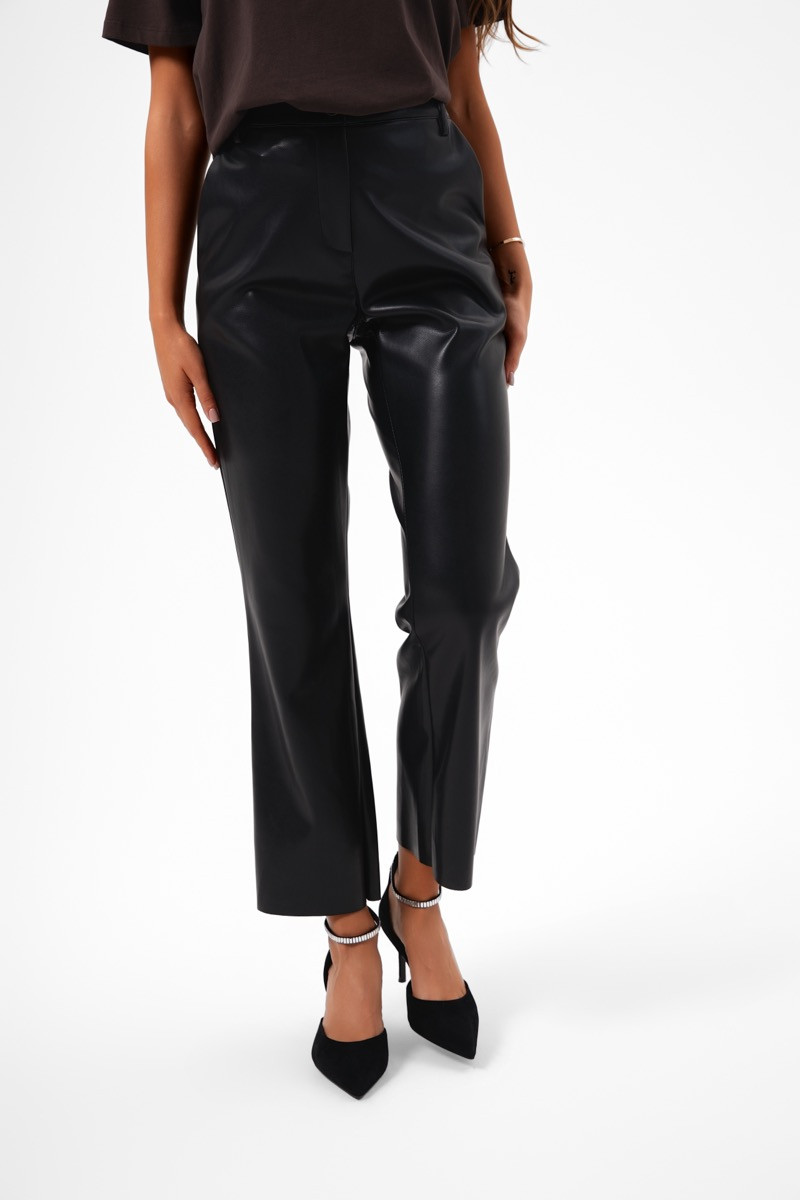 Панталон с висока талия и прав силует, изработен от гладка еко кожа с матов ефект. Структурираната линия подчертава фигурата и създава съвременен, елегантен контраст към меките материи. Идеален избор за вечерен или градски шик.