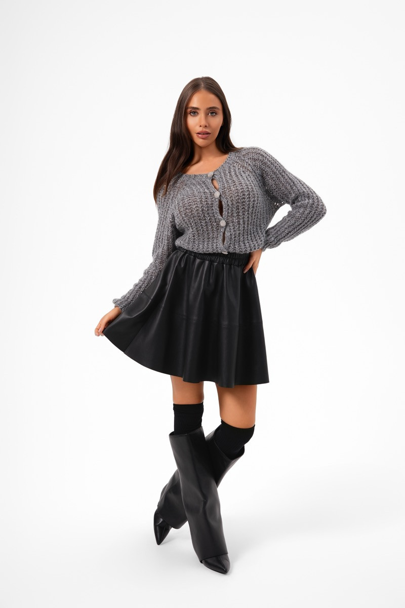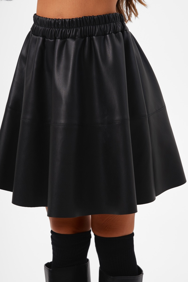 Минималистична и същевременно изразителна пола с А-силует, изработена от мека еко кожа. Моделът приляга перфектно по талията и се разкроява плавно към подгъва, създавайки женствена и модерна линия. Материята е гъвкава и комфортна, което я прави подходяща както за елегантни визии, така и за по-ежедневен стил.