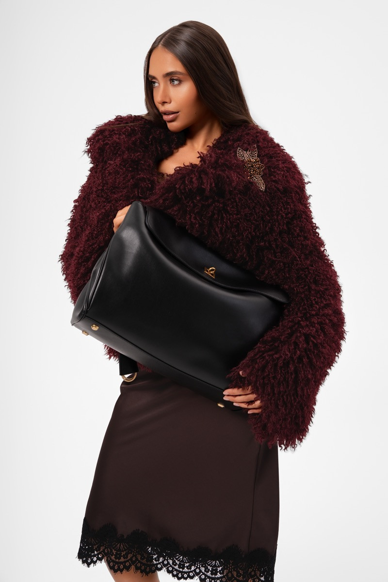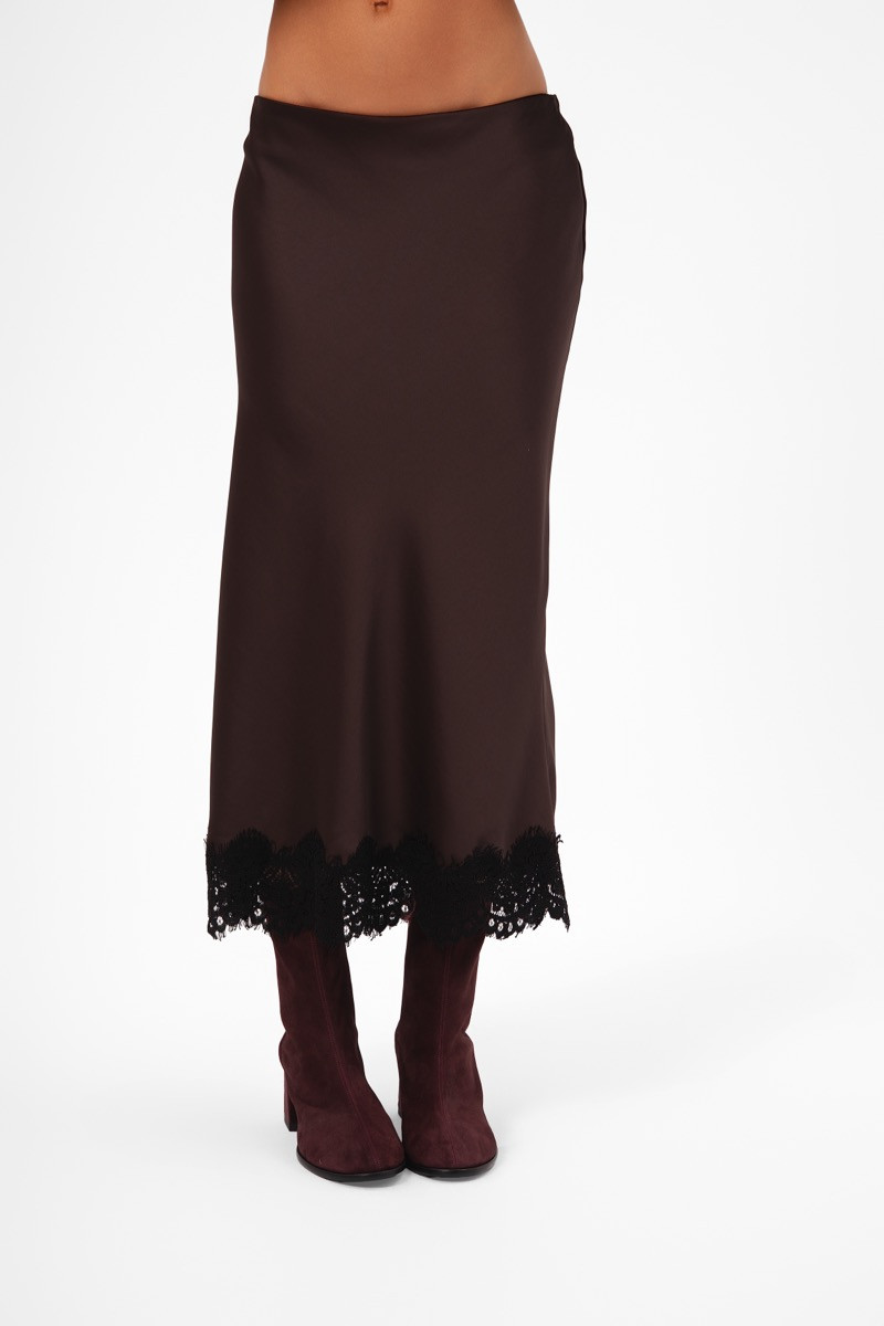 Изтънчена сатенена пола в тъмен шоколадов нюанс, която впечатлява с мек блясък и плавно падаща линия. Моделът е със свободна кройка, която подчертава силуета, без да го пристяга, осигурявайки елегантно движение при всяка стъпка.Долният подгъв е завършен с фина черна дантела, придаваща на полата романтичен и женствен акцент. Материята е лека и гладка, с деликатен сатенен ефект, подходяща за ежедневни и вечерни визии.