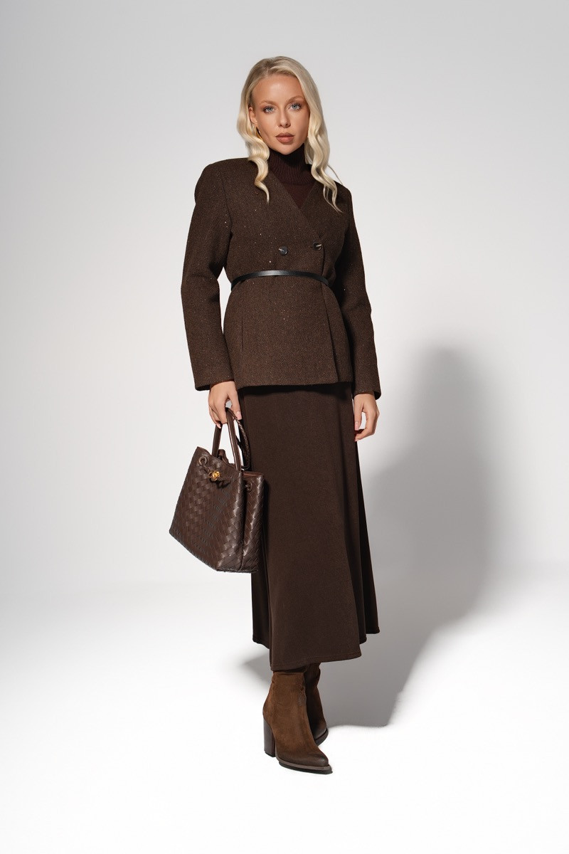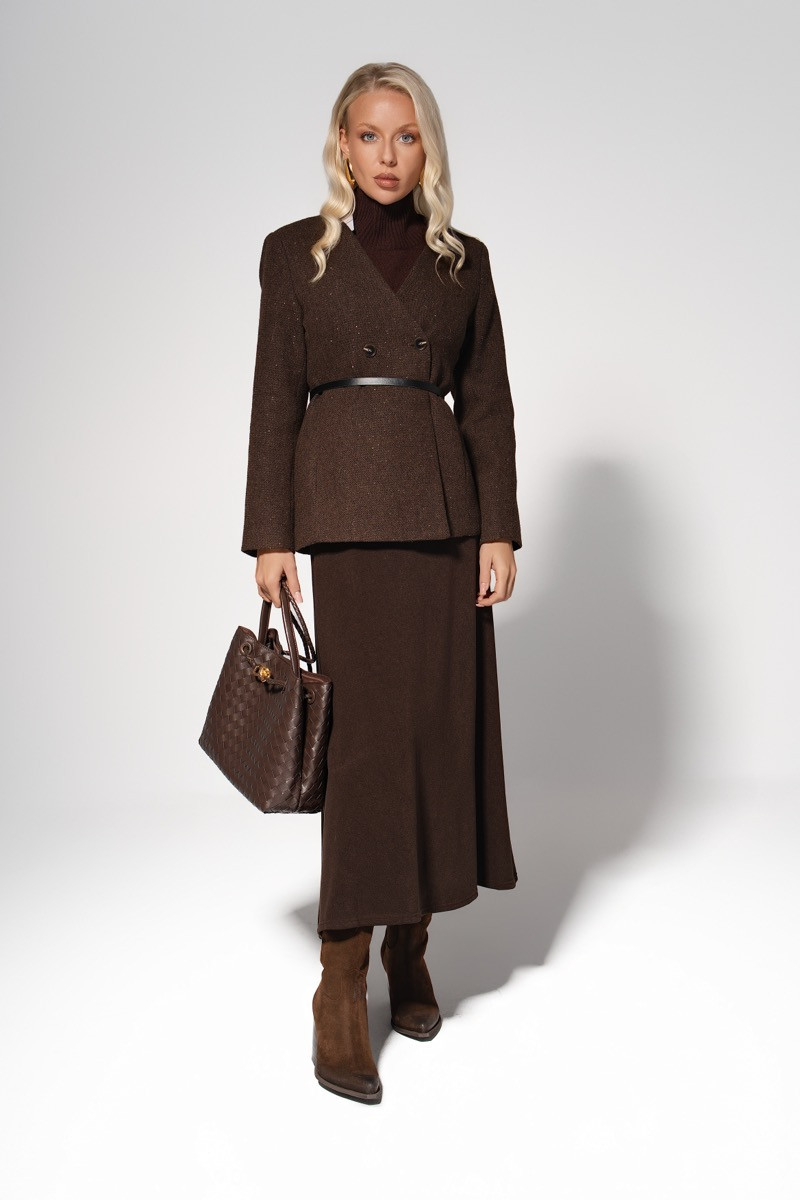 Изчистена пола с дължина до глезена, изработена от мека и еластична материя с фин релеф. Свободната линия осигурява плавно движение и комфорт, докато кафявият нюанс придава усещане за лекота и изтънченост. Перфектен базов модел за модерния минималистичен гардероб.