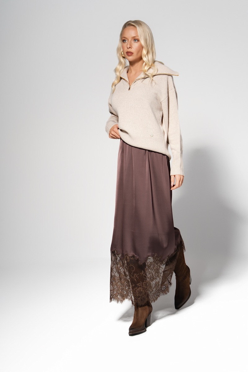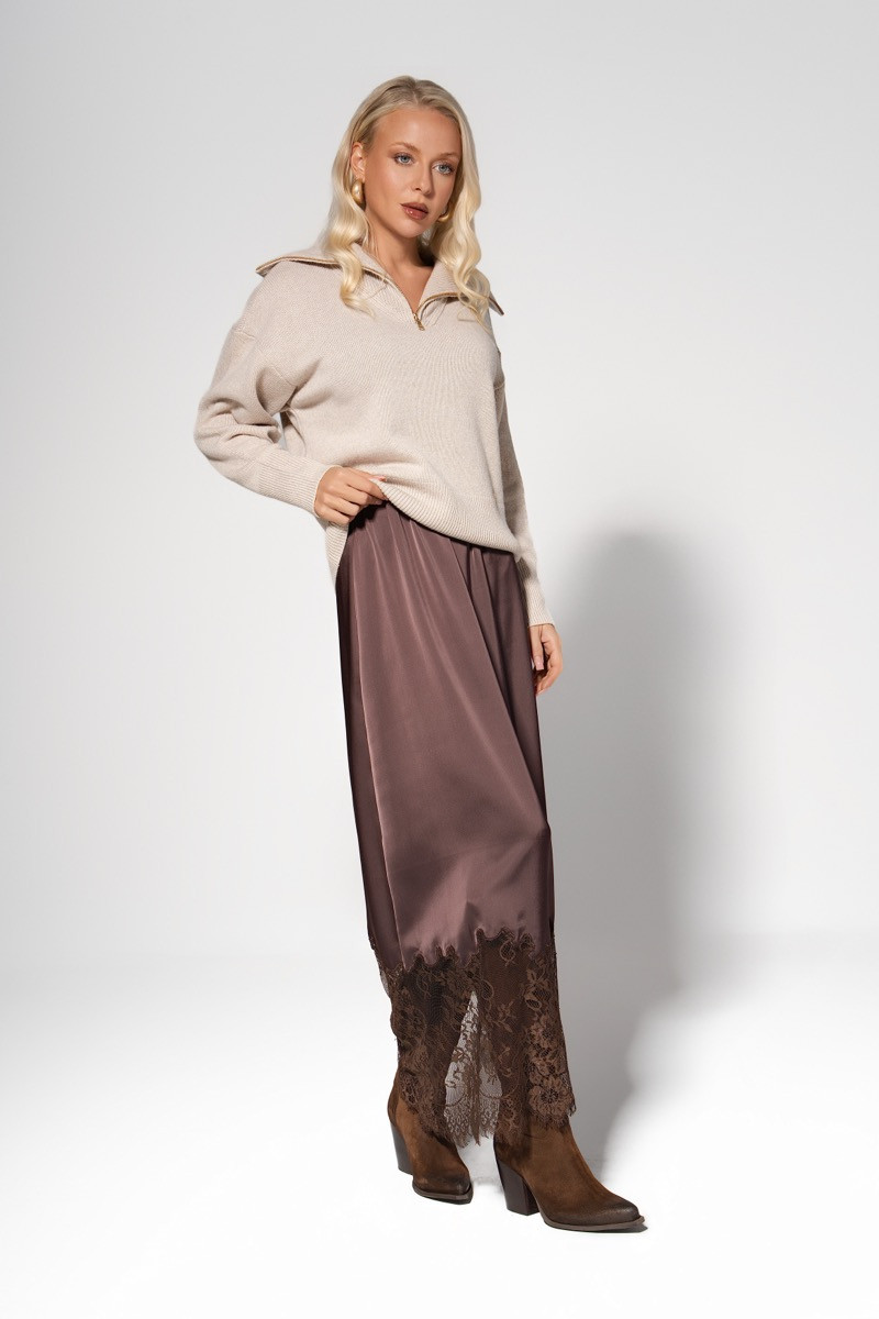 Елегантна сатенена пола с дължина до глезена, съчетаваща мек блясък и женствена линия. Завършва с впечатляваща широка дантелена гарнитура, която придава лекота, движение и изисканост на силуета. Моделът е със свободна линия и удобна талия, което я прави подходяща както за ежедневни визии, така и за по-елегантни комбинации.Перфектна в съчетание с плетива, блузи и ботуши за съвременна, effortless естетика.