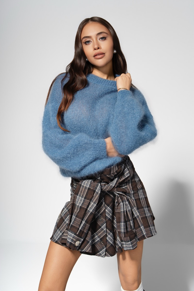 Plaid Mini Wrap Skirt е модерна интерпретация на класическата каре пола – игрива, динамична и създадена, за да прави впечатление. Скроена в елегантна мини дължина, тя комбинира мека материя, структурирани плисета и характерния за модела wrap ефект с декоративно прехлупване отпред.Дълбоките кафяви тонове, преплетени с кремави и сиви линии, създават палитра, която effortlessly се съчетава както с плетива в пастелни нюанси, така и с по-структурирани връхни дрехи. Силуетът е женствен и динамичен, придавайки движение и лекота на всяка визия.