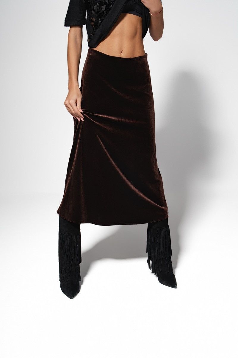 Velvet Chocolate Midi Skirt е въплъщение на елегантност и кадифена мекота. Изработена от висококачествен велур с деликатен блясък, тази пола пада плавно по тялото и подчертава силуета с изчистена линия и изтънчен характер.Миди дължината добавя класа, а наситеният шоколадов цвят я прави подходяща за стилни зимни визии, вечерни събития или комбиниране с плетива за ежедневен лукс.