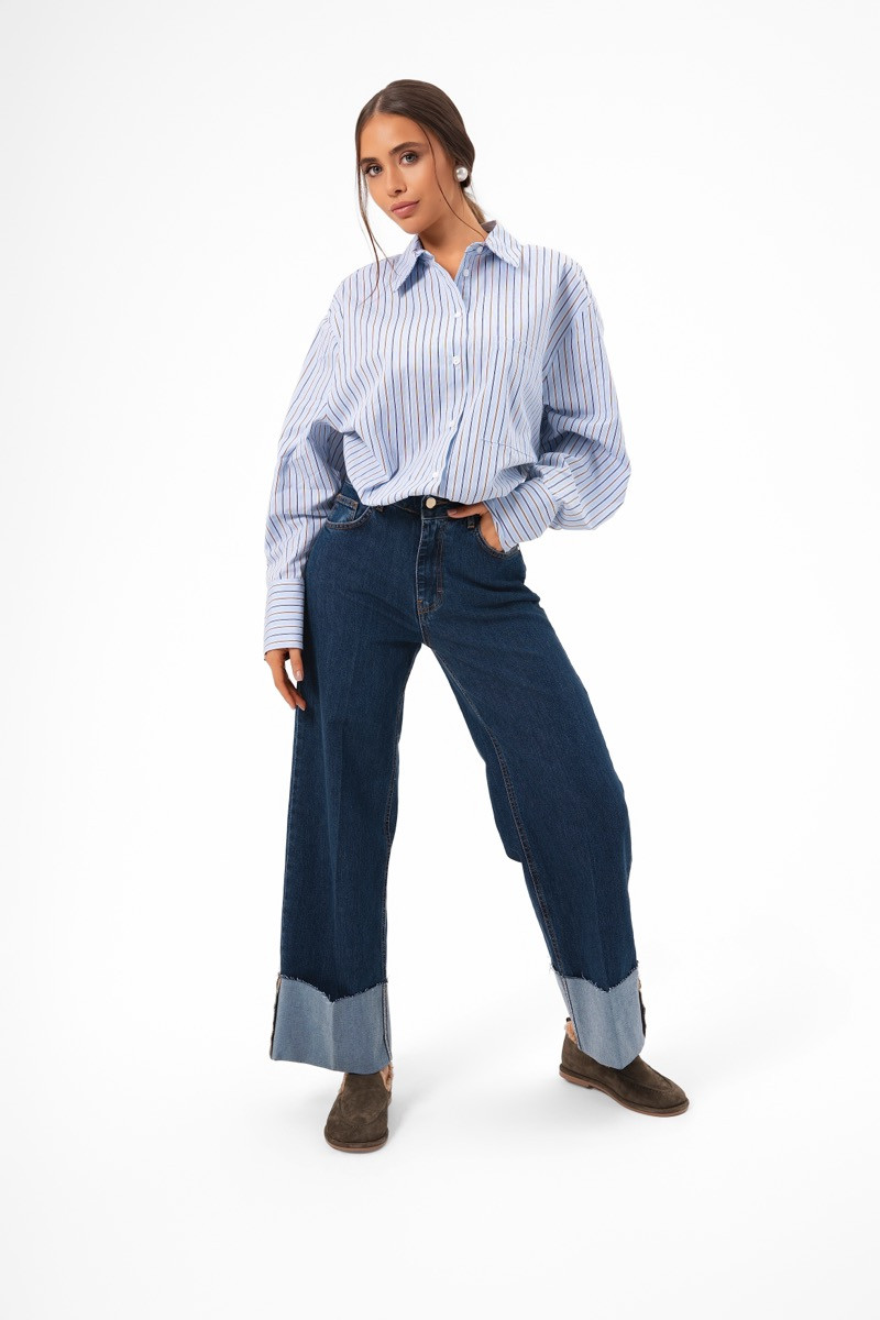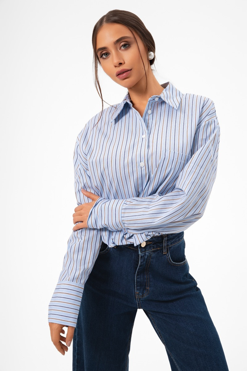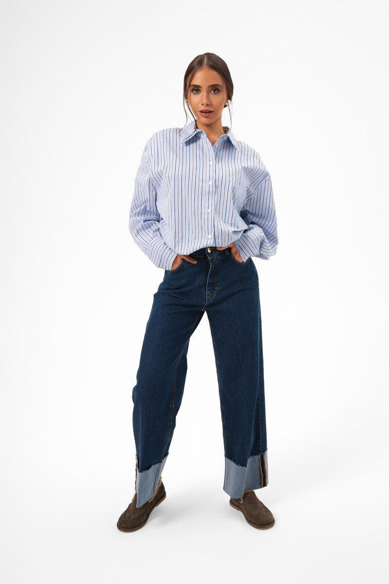 Риза от фин памучен плат с класическа яка и елегантна ивица в синя гама. Свободната кройка създава лек, небрежен силует с модерно излъчване. Универсален модел, който effortlessly се комбинира както с дънки, така и с елегантни панталони.