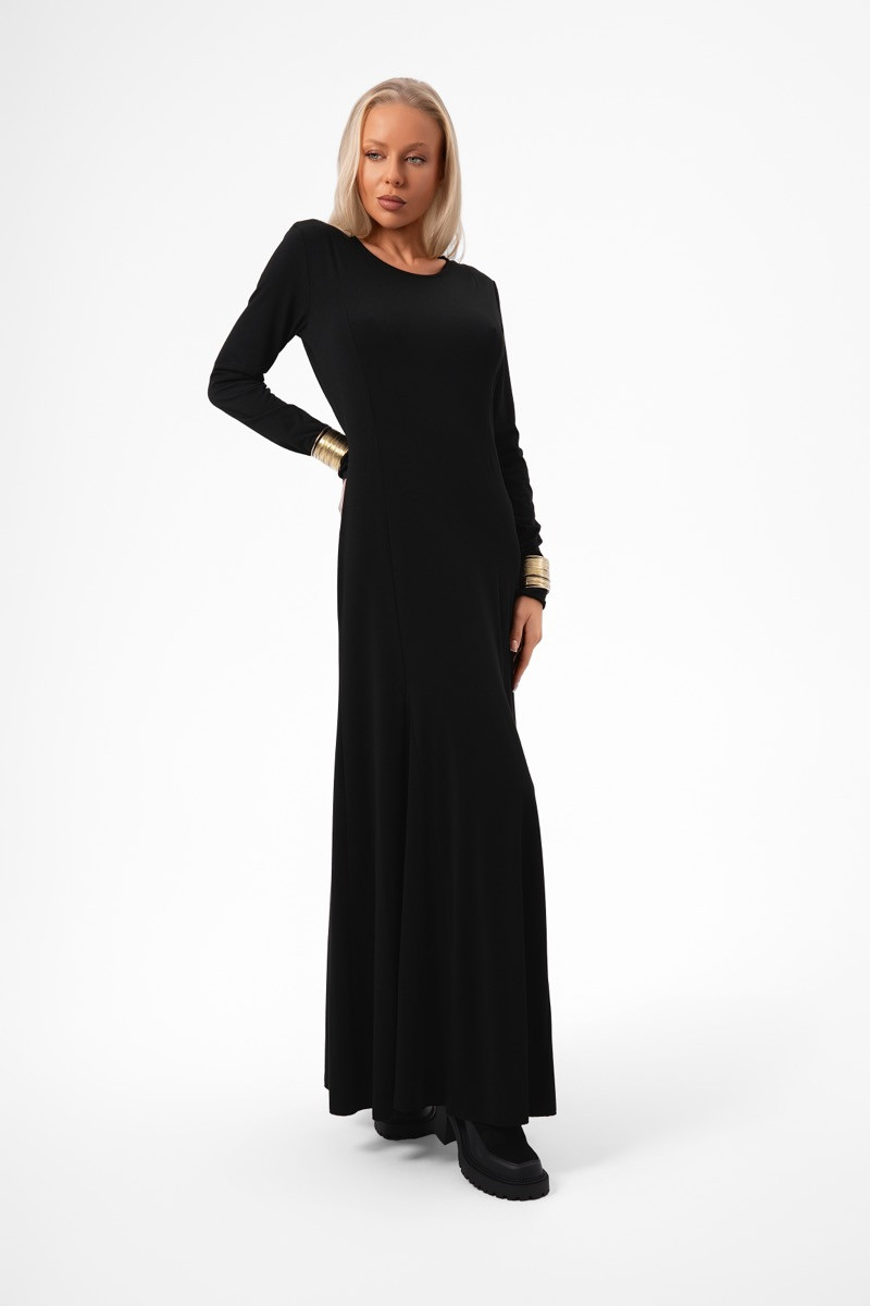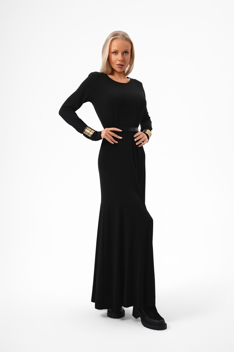 Дълга елегантна рокля в наситен черен нюанс, изработена от мека и еластична материя, която нежно подчертава женствената линия на тялото. Моделът е с дълъг ръкав и овално деколте, излъчващо фин минимализъм. Специален акцент са златните гривни, пришити към ръкавите, които превръщат визията в израз на съвременен лукс и индивидуалност.