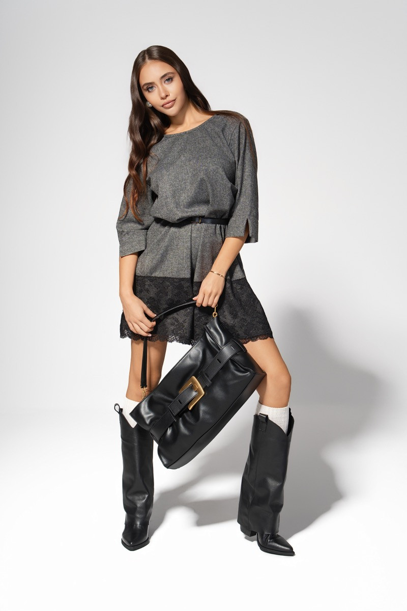 Елегантна мини рокля в топъл сив нюанс, съчетаваща мек текстилен финиш с изискана дантелена долна част. Моделът е със семпла горна линия, 3/4 ръкав с фин разрез и деликатно подчертаване на талията чрез тънък колан. Полата пада красиво и леко разкроено, като дантелата добавя женственост и луксозен контраст.