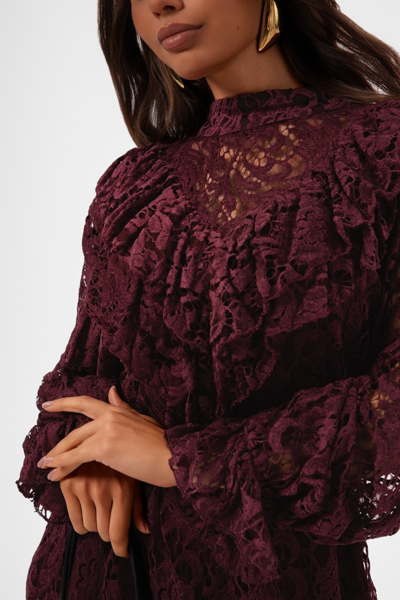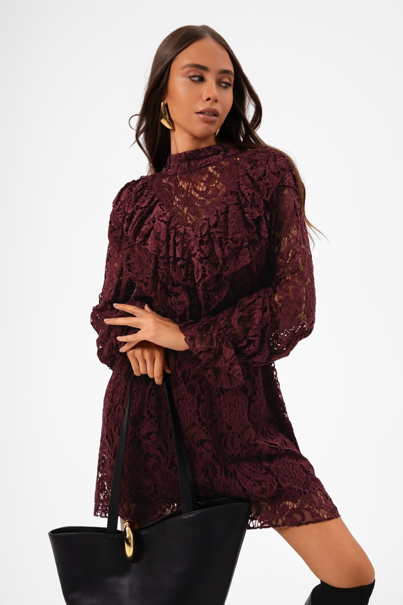 Бордо дантелена рокля с романтичен силует и изискана визия. Моделът е изработен от фина дантела с флорален мотив и деликатна прозрачност по ръкавите, придаваща женственост и лекота. Горната част е украсена с ефирни къдри, които създават обем и текстура, докато свободната линия подчертава естествената грация на силуета.Роклята е подходяща както за ежедневен шик, така и за специални поводи, като може лесно да се комбинира с различни аксесоари — от елегантни обувки до груби ботуши за модерен контраст.