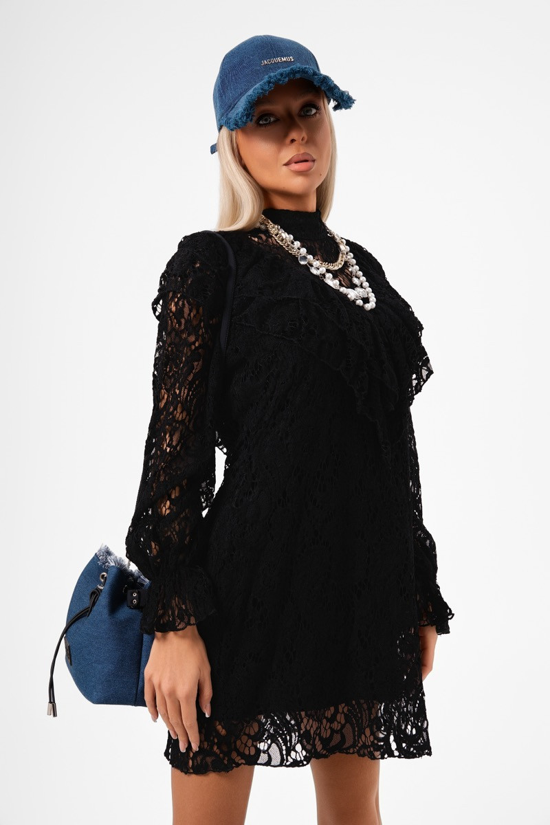 Черна дантелена рокля с романтичен силует и изискана визия. Моделът е изработен от фина дантела с флорален мотив и деликатна прозрачност по ръкавите, придаваща женственост и лекота. Горната част е украсена с ефирни къдри, които създават обем и текстура, докато свободната линия подчертава естествената грация на силуета.Роклята е подходяща както за ежедневен шик, така и за специални поводи, като може лесно да се комбинира с различни аксесоари — от елегантни обувки до груби ботуши за модерен контраст.