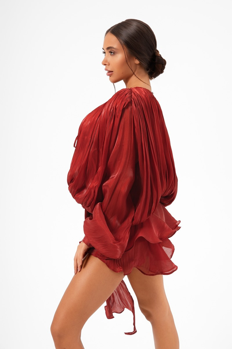 Къса червена рокля от ефирна, сатенена материя с фин блясък и панталонки в тон. Свободната линия създава леко, елегантно движение, а панталонките осигуряват комфорт и съвременна визия. Идеален баланс между женственост и модерен силует.