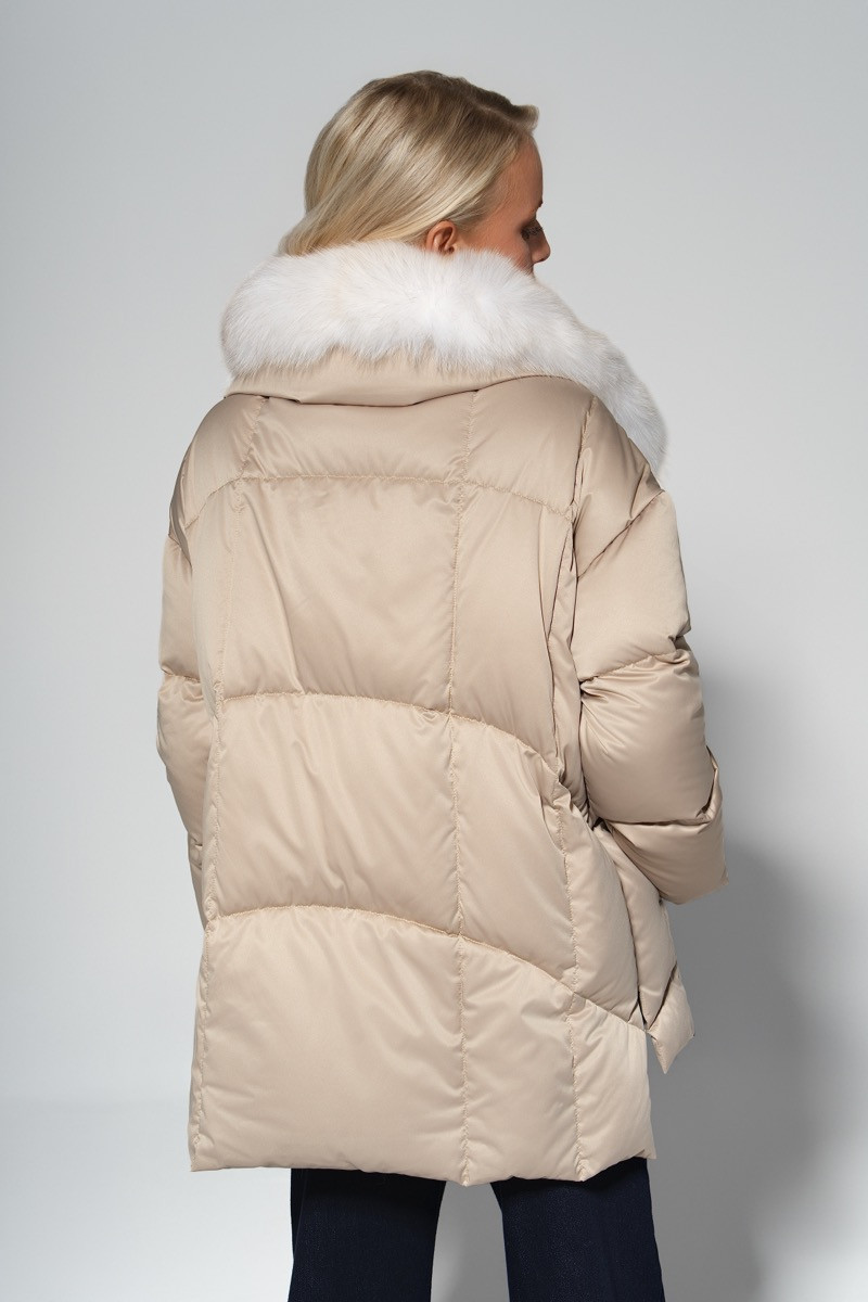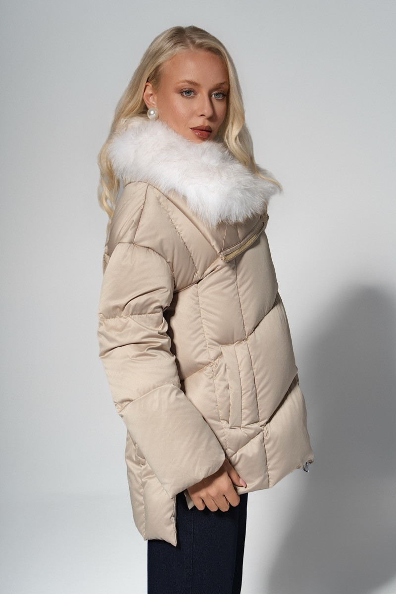 Модерно, топло и изключително стилно – това зимно яке в нежен бежов нюанс е създадено за жени, които обичат комфорта, но не правят компромис с елегантността. Впечатляващата яка от естествен бял косъм добавя усещане за изисканост и подчертава женствеността във всяка визия.Асиметричното закопчаване с цип придава модерен характер и позволява различни начини на оформяне на яката, според настроението и времето. Пухкавата, но лека конструкция осигурява отлична топлина, а бежовият цвят съчетава универсалност и луксозно излъчване.